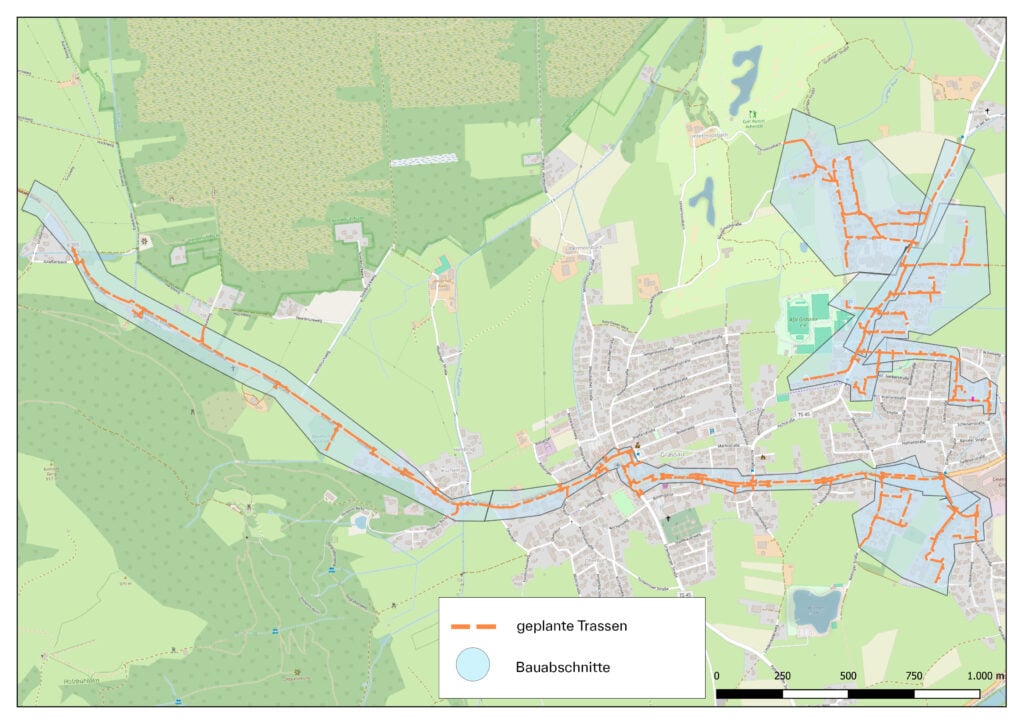 Die Tiefbauarbeiten und die Installation der ersten Hausanschlüsse beginnen im Ortsteil Reifing. Von dort aus arbeiten sich die Bautrupps entlang der Rottauer Straße weiter durch das Ausbaugebiet.
