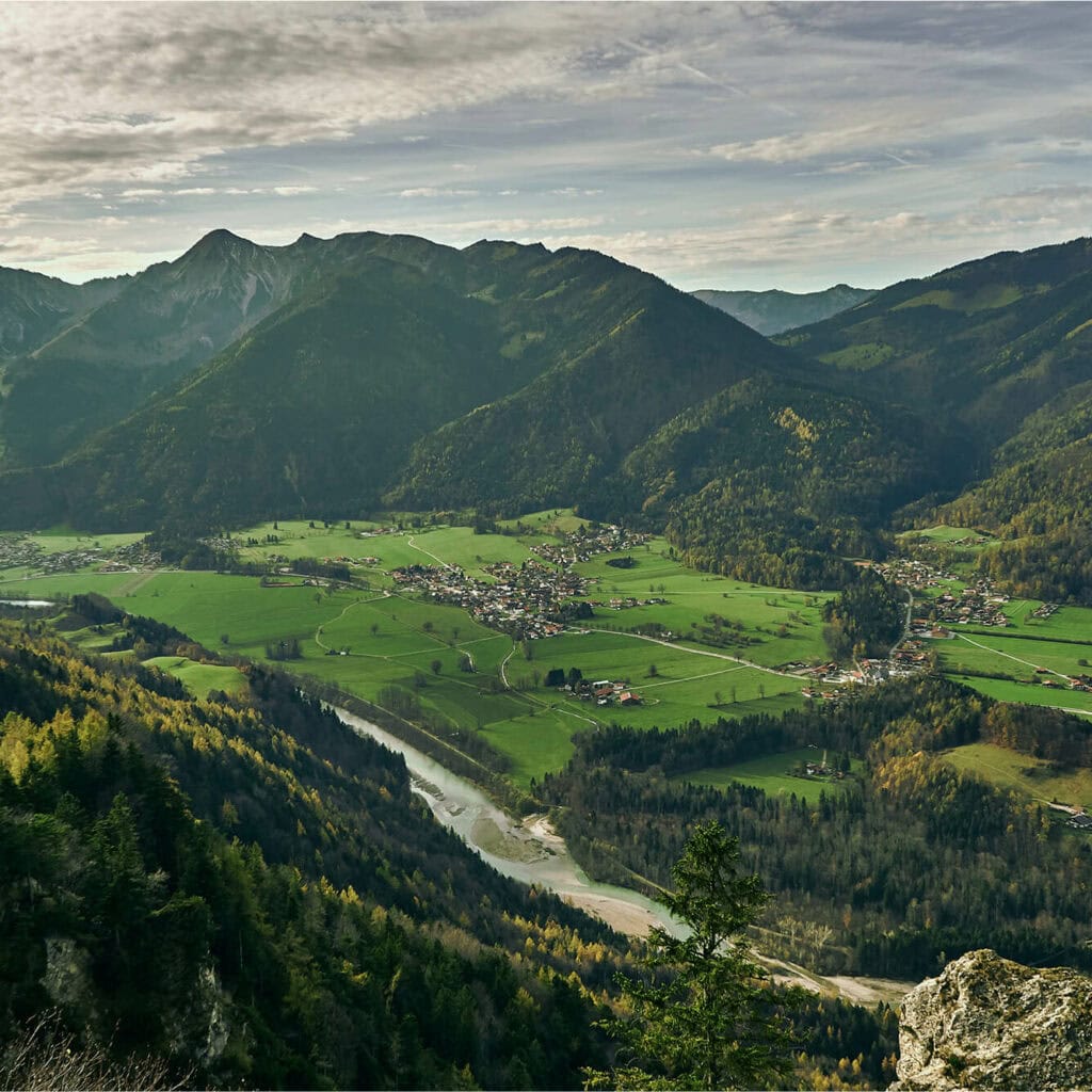 Zwei Wanderer mit Blick über das Tal – AVACOMM bringt Glasfaser auch in abgelegene Regionen und Randgebiete für zukunftssichere Konnektivität von Glasfaserverbindungen.